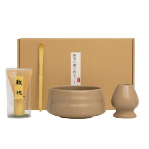 ست تشریفاتی چای ژاپنی ماچا شامل ویسک یا همزن چوبی بامبو، بول یا کاسه ماچا با حجم ml 580، چاشاکو یا پیمانه ی بامبو، هولدر یا نگهدارنده ی ویسک است.